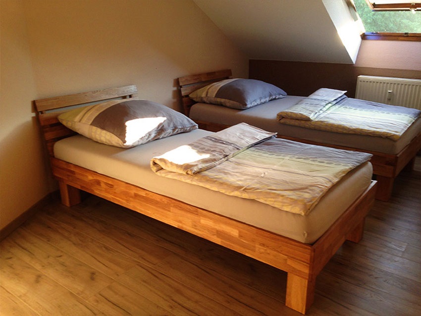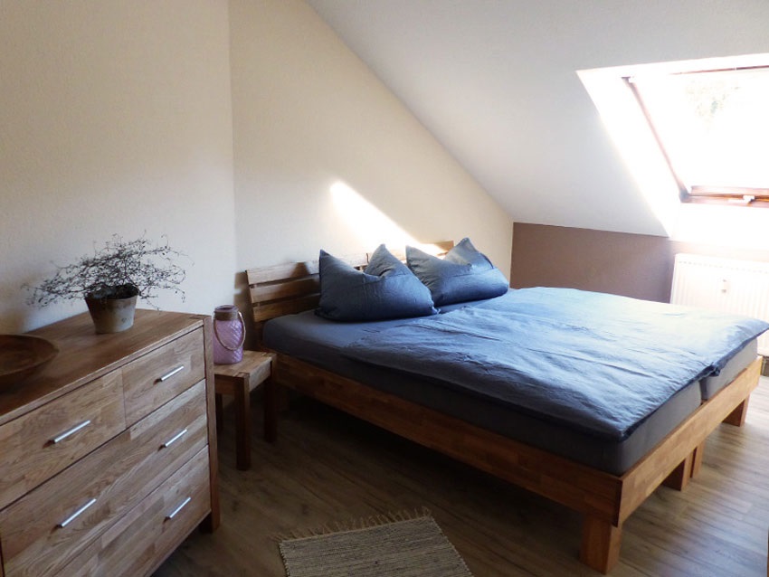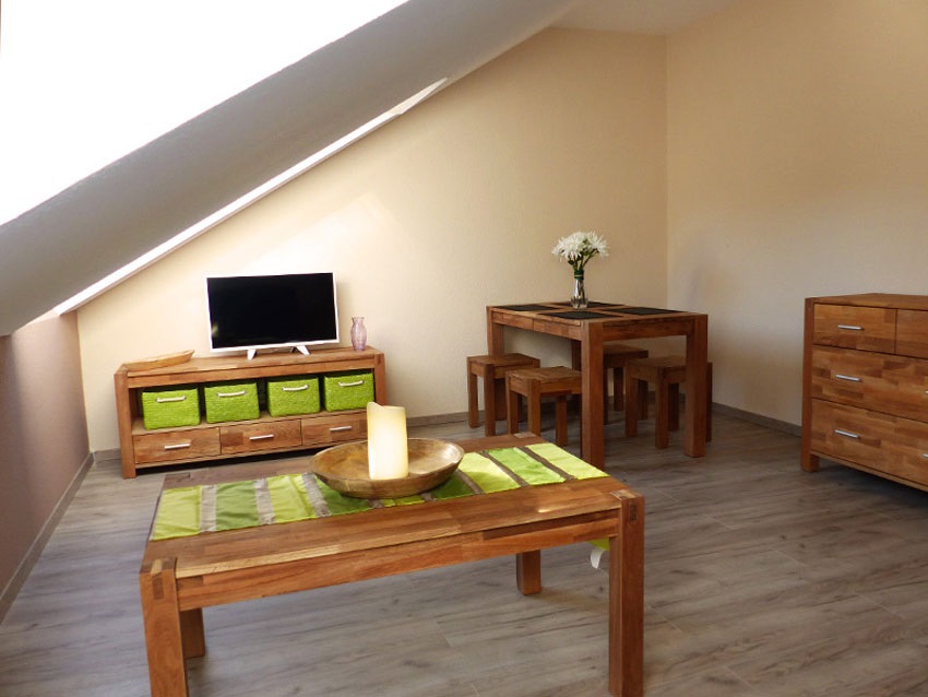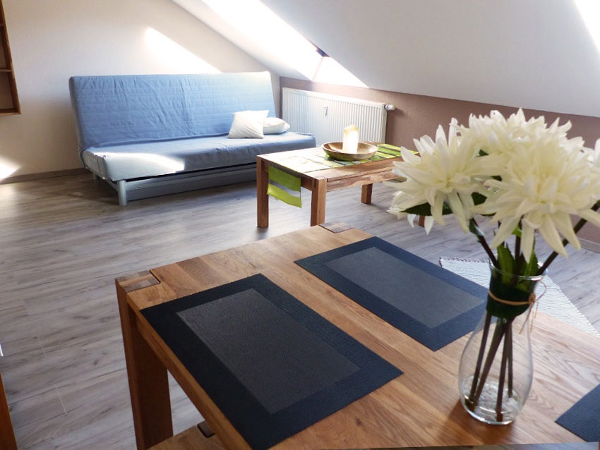 geräumige Ferienunterkunft im Dachgeschoss: 1 Wohnzimmer mit Schlafcouch, 1 Schlafzimmer mit Doppelbett und Kleiderschrank