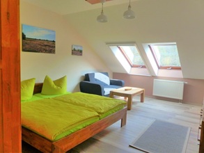 - familienfreundliche Ferienwohnung im Dachgeschoss mit kombiniertem Wohn-/Schlafzimmer (Doppelbett, Schlafcouch, großer Kleiderschrank) und Kinderzimmer mit Doppelstockbett und Spielbereich