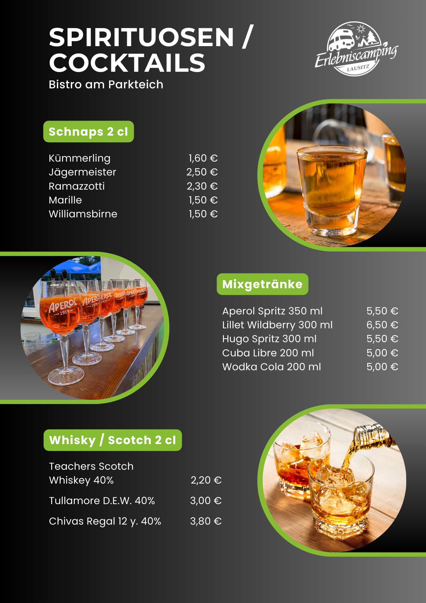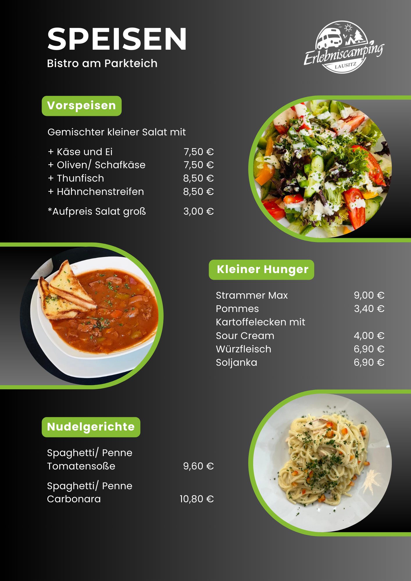 Das Bistro des Erlebniscamping Lausitz befindet sich im Hauptgebäude auf dem Campingplatz in Ortrand. Die Innenräume sind gemütlich und modern für 26 bis 30 Gäste eingerichtet. Im Biergarten finden an warmen Tagen weitere Gäste Genuss unter freiem Himmel. Das kleine Restaurant ist ebenerdig gelegen und stufenlos erreichbar. Ein barrierefreies Gäste-WC steht zusätzlich zur Verfügung. Unsere Gäste können Ihre Pkw`s kostenfrei auf dem Außenparkplatz abstellen. Fahrradständer sind vorhanden. Die Speisekarte wird saisonal ergänzt durch besondere Tagesgerichte wie Lamm-Spezialitäten, Spargel-Gerichte oder Gänsekeule mit Rotkraut und Klößen.